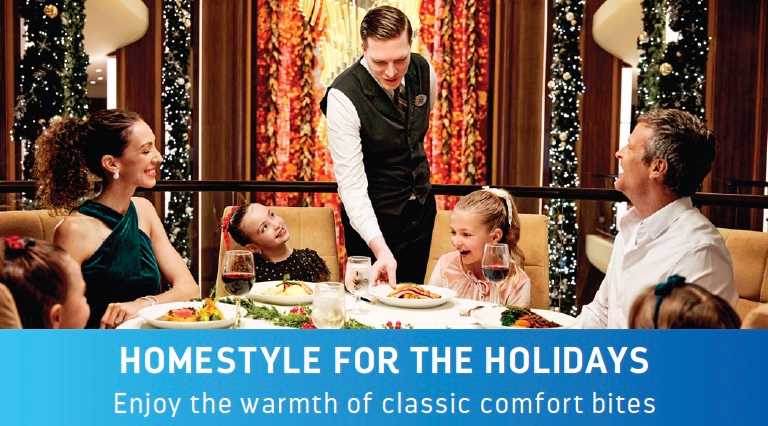 Pack your appetite - all your favorite flavors of the holiday season are onboard. Savor mouthwatering Thanksgiving staples like oven-roasted turkey and old-fashioned pecan pie. Celebrate Hannukah with a tender brisket alongside honey glazed carrots, crispy potato latkes with sour cream and apple sauce, and pillowy jelly donuts. Plus, a festive feast of Christmas dinner classics, from honey baked ham to homemade sides and decadent desserts. And your little ones won't miss the chance to get on Santa's good side, with plenty of milk and cookies on hand.