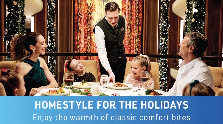 Pack your appetite - all your favorite flavors of the holiday season are onboard. Savor mouthwatering Thanksgiving staples like oven-roasted turkey and old-fashioned pecan pie. Celebrate Hannukah with a tender brisket alongside honey glazed carrots, crispy potato latkes with sour cream and apple sauce, and pillowy jelly donuts. Plus, a festive feast of Christmas dinner classics, from honey baked ham to homemade sides and decadent desserts. And your little ones won't miss the chance to get on Santa's good side, with plenty of milk and cookies on hand.