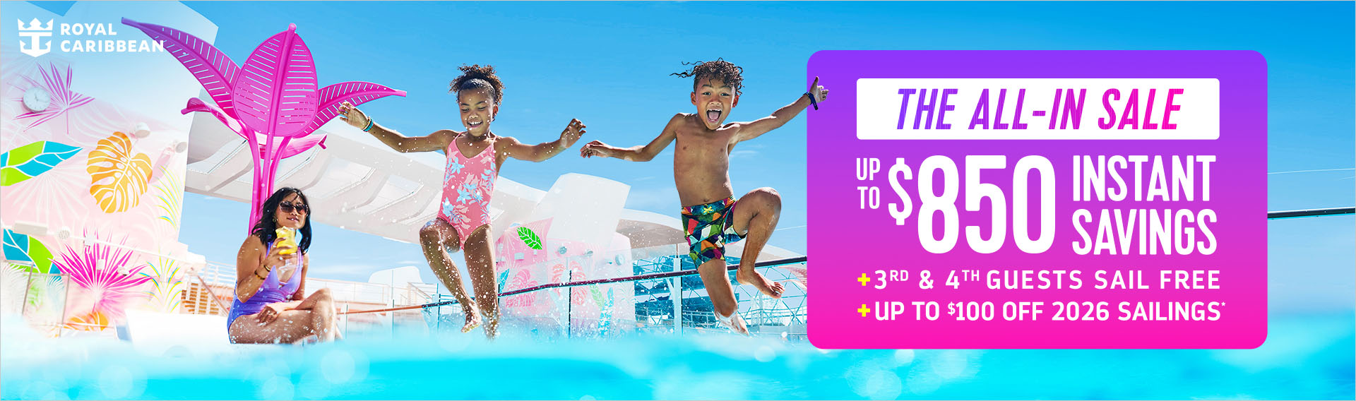 General Terms: Instant savings amount shown in USD and will be converted to currency used for cruise purchase applied as instant rebate to the cruise fare at checkout reflected as “Dollars Off” or “Savings”. All other charges, including taxes, fees, and port expenses, where not included in the price displayed are additional and apply to all guests. Changes to the booking may result in the removal of the offer. Individual reservations may be transferred into an existing group, assuming the required criteria are met; full deposit will be required at time of transfer. Failure to apply the required full deposit amount may result in the cancellation of the booking. Single occupancy guests paying 200% cruise fare are eligible for full offer; single occupancy guests paying less than 200% cruise fare are eligible for a prorated amount of the offer. Offers available to residents of United States, Canada, Puerto Rico, and select countries in the Caribbean. Prices and offers are subject to availability and change without notice; capacity controlled and may be withdrawn at any time. Refer to www.RoyalCaribbean.com for complete terms and conditions. Royal Caribbean International reserves the right to correct any errors, inaccuracies, or omissions and to change or update fares, fees, and surcharges at any time without prior notice. ©2026 Royal Caribbean Cruises Ltd. Ships’ registry: Bahamas.