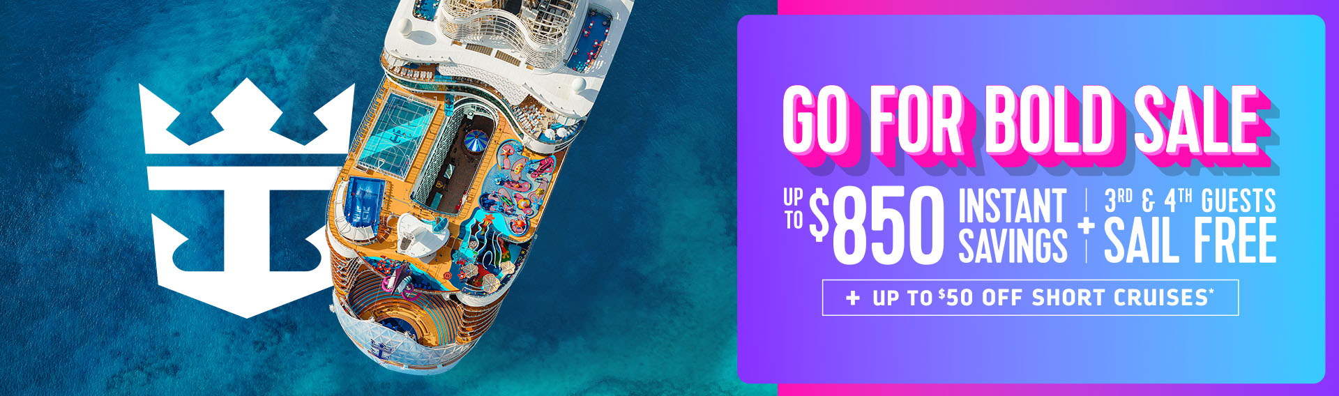 General Terms: Instant savings amount shown in USD and will be converted to currency used for cruise purchase applied as instant rebate to the cruise fare at checkout reflected as “Dollars Off” or “Savings”. All other charges, including taxes, fees, and port expenses, where not included in the price displayed are additional and apply to all guests. Changes to the booking may result in the removal of the offer. Individual reservations may be transferred into an existing group, assuming the required criteria are met; full deposit will be required at time of transfer. Failure to apply the required full deposit amount may result in the cancellation of the booking. Single occupancy guests paying 200% cruise fare are eligible for full offer; single occupancy guests paying less than 200% cruise fare are eligible for a prorated amount of the offer. Offers available to residents of United States, Canada, Puerto Rico, and select countries in the Caribbean. Prices and offers are subject to availability and change without notice, capacity controlled and may be withdrawn at any time. Refer to www.RoyalCaribbean.com for complete terms and conditions. Royal Caribbean International reserves the right to correct any errors, inaccuracies, or omissions and to change or update fares, fees, and surcharges at any time without prior notice. ©2026 Royal Caribbean Cruises Ltd. Ships’ registry: Bahamas.