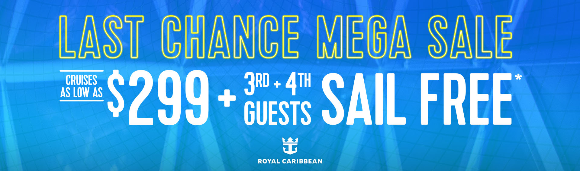Last Chance Mega Sale applies to new and individual bookings made February 5, 2026 – February 11, 2026, on the sailings listed under “Last Chance Mega Sale” under the Deals section of RoyalCaribbean.com and provides discounted pricing at the rates displayed. Last Chance Mega Sale sailings are combinable with Free 3rd and 4th Guests but are NOT combinable with any other offer or promotion, including but not limited to BOGO60, Kids Sail Free, promotional OBCs, Next Cruise offers, instant savings, restricted discounts (e.g. Seniors, Residents, Military), Promo Code driven offers, Crown and Anchor discounts, Shareholder Benefits, Standard Group, Interline, Travel Agent, Travel Agent Friends and Family, Weekly Sales Events and Net rates. Individual reservations may be transferred into an existing group, assuming required criteria are met; full deposit will be required at time of transfer. Failure to apply the required full deposit amount may result in a cancellation of the booking. Last Chance Mega Sale is available to residents of United States, Canada, Puerto Rico, and select countries. Prices and offers are subject to availability and change without notice; capacity controlled and may be withdrawn at any time. Refer to www.RoyalCaribbean.com for additional terms and conditions. Royal Caribbean International reserves the right to correct any errors, inaccuracies, or omissions and to change or update fares, fees, and surcharges at any time without prior notice. ©2026 Royal Caribbean Cruises Ltd. Ships’ registry: Bahamas.