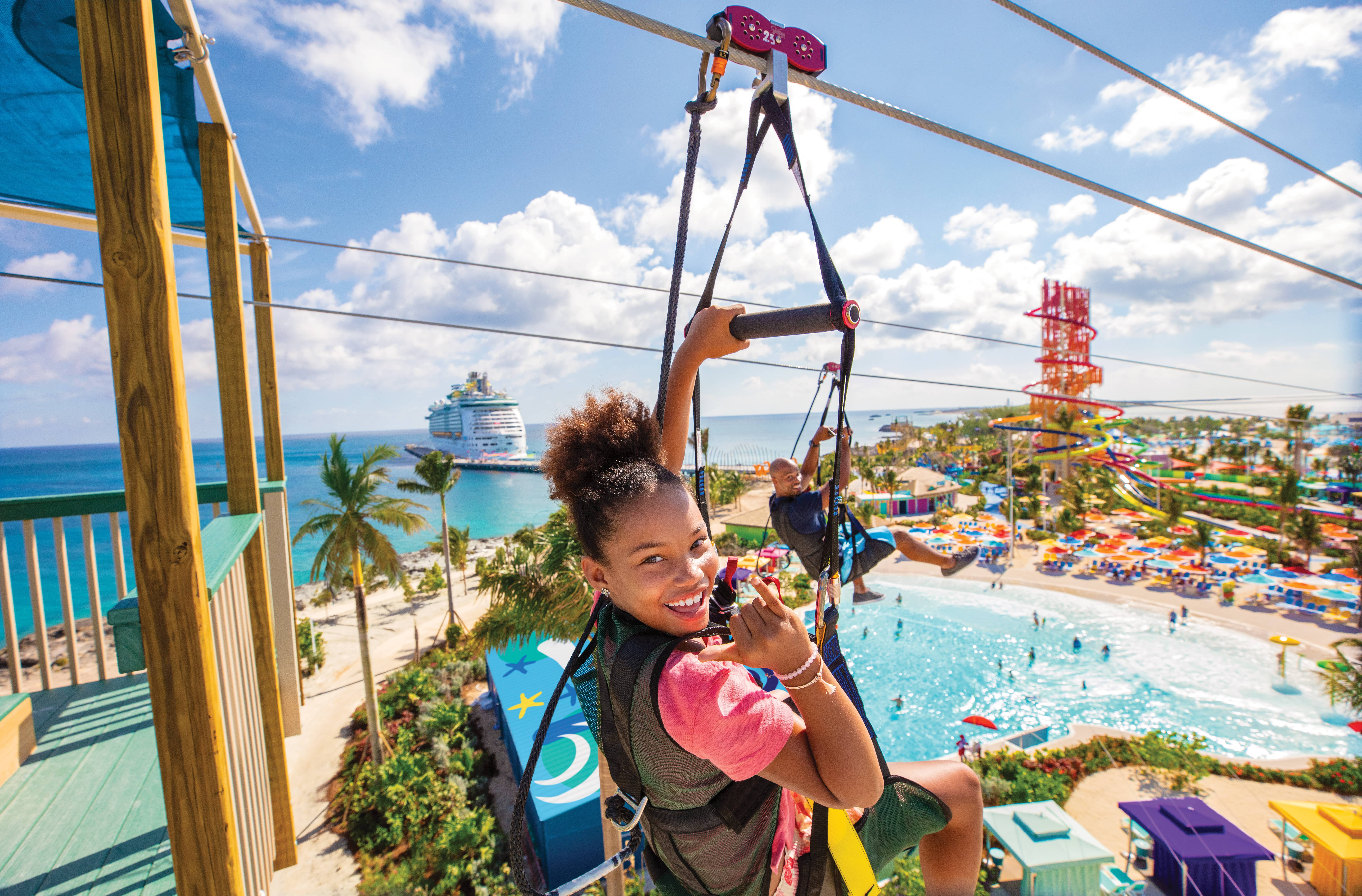 Experience Perfect Day at CocoCay, voted Best Private Island! Enjoy family fun at Splashaway Bay, relax on South Beach, and savor complimentary food. If you have a beverage package, enjoy unlimited cocktails. For thrills, conquer 14 slides at Thrill Waterpark and the Caribbean’s largest wave pool.